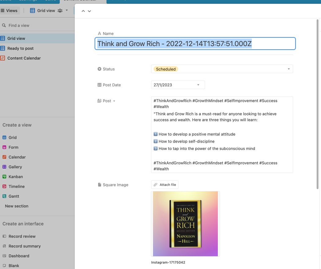 Make sure to create a content calendar table with a field for your post text and image. Store the values from your workflow responses in there. Update your Book record with the status of “Done” to have a reference that you have created a social post for a record.